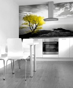 Rewelacyjna fototapeta z drzewem na skale, sprawdzi się świetne jako dekoracja salonu. Tapeta w odcieniach szarości z żółtymi dodatkami.