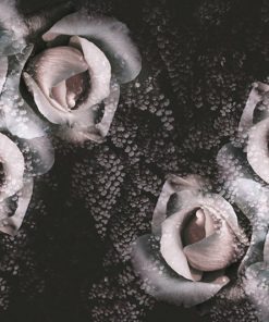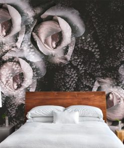 Zachwycająca tapeta z motywem pięknych róż i roślin. Dekoracja w stonowanej kolorystyce. Ozdoba idealnie będzie pasowała do salonu lub sypialni.